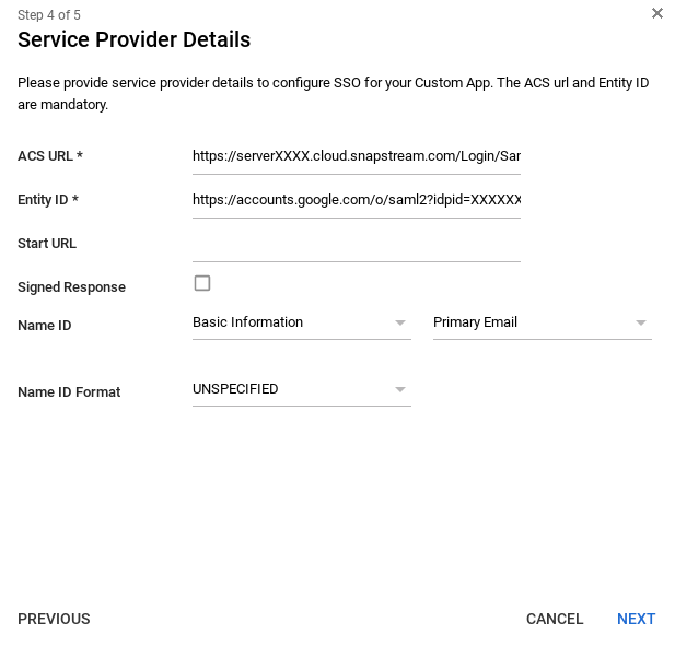 Once that is done, head back to Google and enter the ACS and Entity ID. The ACS URL should be already provided in the SnapStream SAML configuration page and copy the SAML Issuer info and copy it onto the Entity ID field.