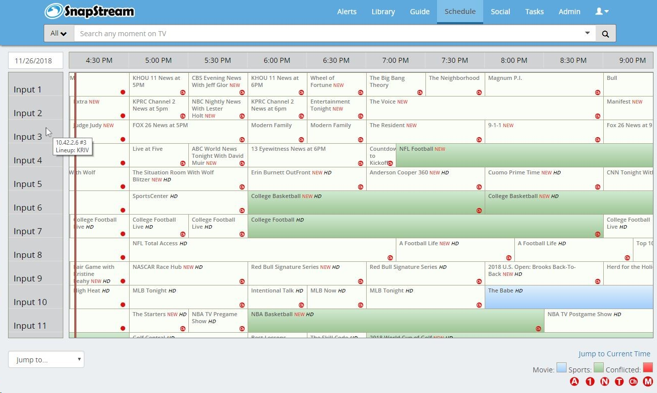 Starting with SnapStream Software version 9.1, you can now visualize your recording schedule in a grid that shows what tuner input is being used for each of the upcoming programs that your SnapStream system will be recording. This view can be handy for visualizing why recording conflicts are occurring.